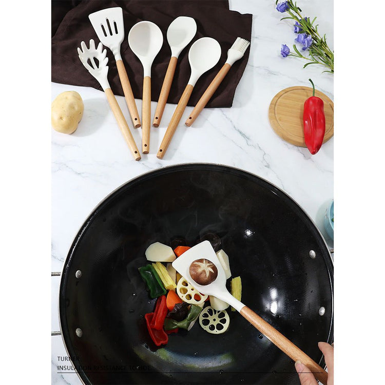 11-Piece Silicone Kitchen Utensil Set with Wooden Handles and Storage Bucket - Heat-Resistant and Non-Stick