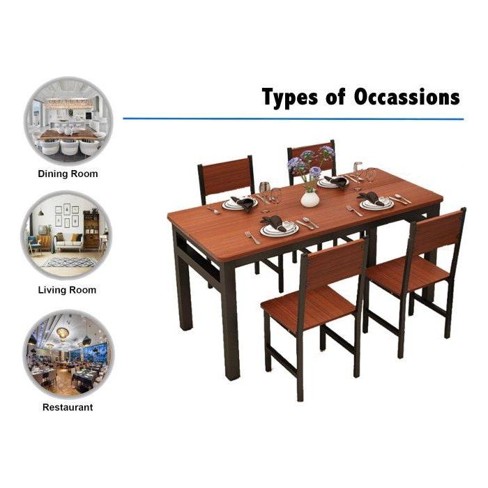 The 5-piece Dining Table & Chairs Set showcases a sleek and sophisticated design. This exceptional set effortlessly combines the comforting warmth of wood with the refined elegance of steel, adding a touch of style and class to your home decor. Its versatile design seamlessly blends with various home styles, offering unmatched multi-functional versatility.