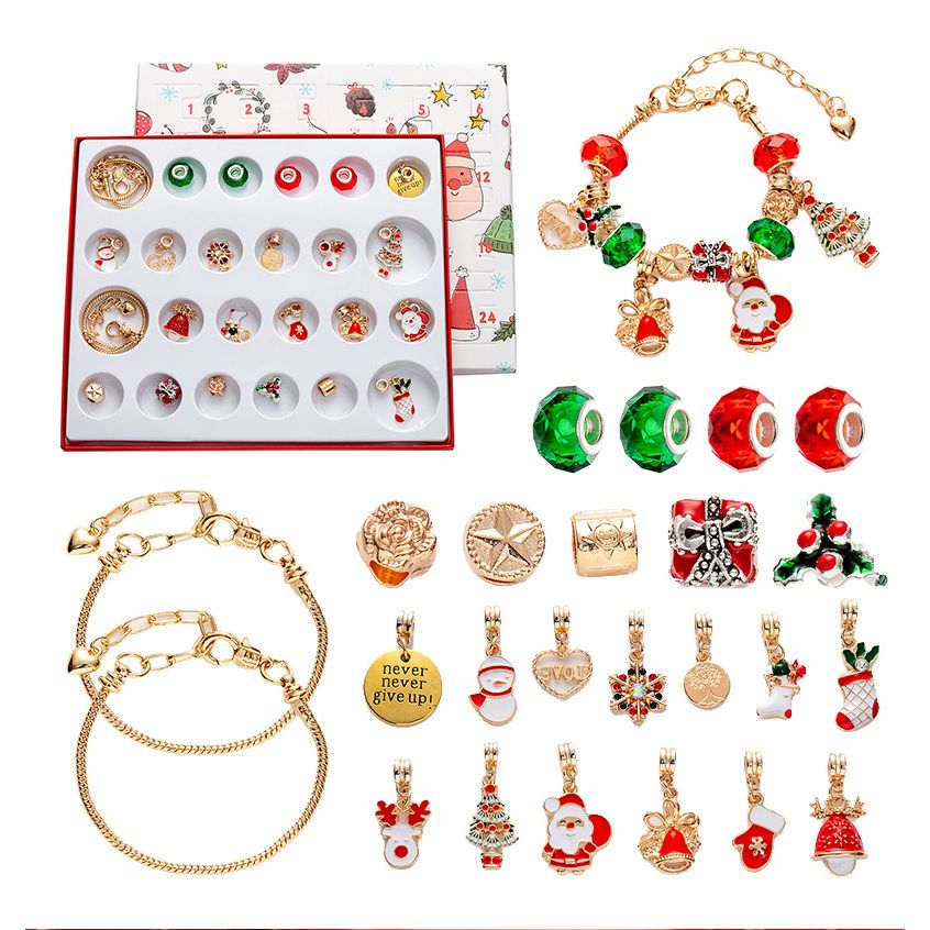 Bring festive joy and creative fun to the holiday season with this delightful 24-day DIY Christmas advent calendar jewelry kit, designed especially for children and families. Each day leading up to Christmas, uncover a new surprise charm from the beautifully organized compartment box, encouraging daily excitement and anticipation. The set includes a stylish silver-tone bracelet chain, multiple colorful holiday-themed charms such as snowflakes, reindeer, Santa Claus, Christmas trees, stockings, and more, along with decorative beads in classic red, green, and gold tones. Kids can personalize their own bracelets by mixing and matching charms, fostering creativity, fine motor skills, and seasonal enthusiasm. The durable metal components and vibrant enamel finishes ensure long-lasting use and beautiful shine. Perfect for gifting, classroom activities, or family traditions during the holiday countdown.