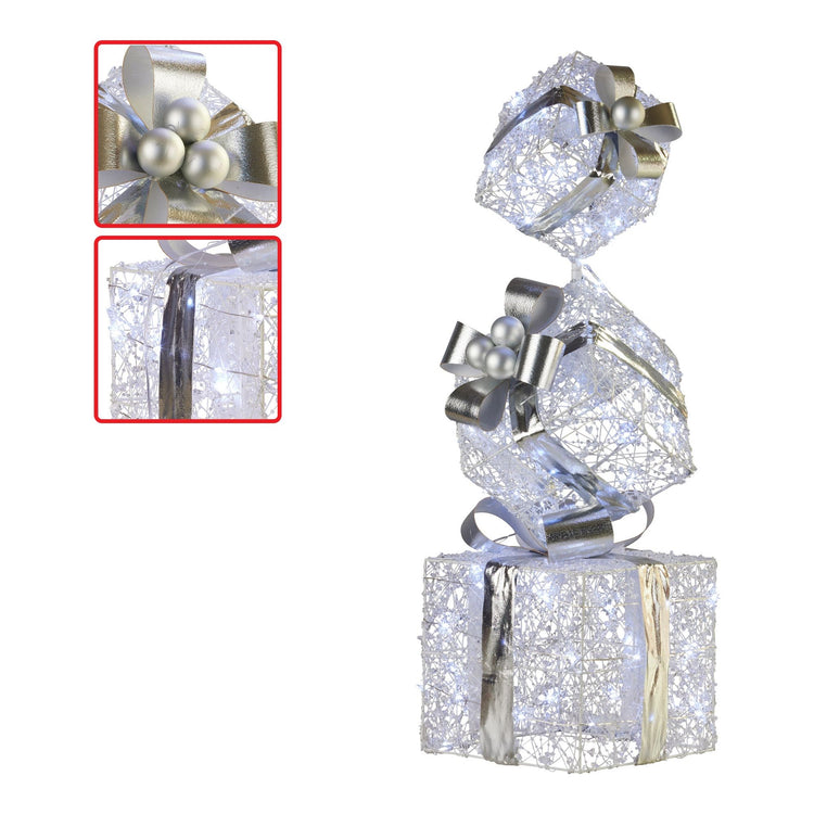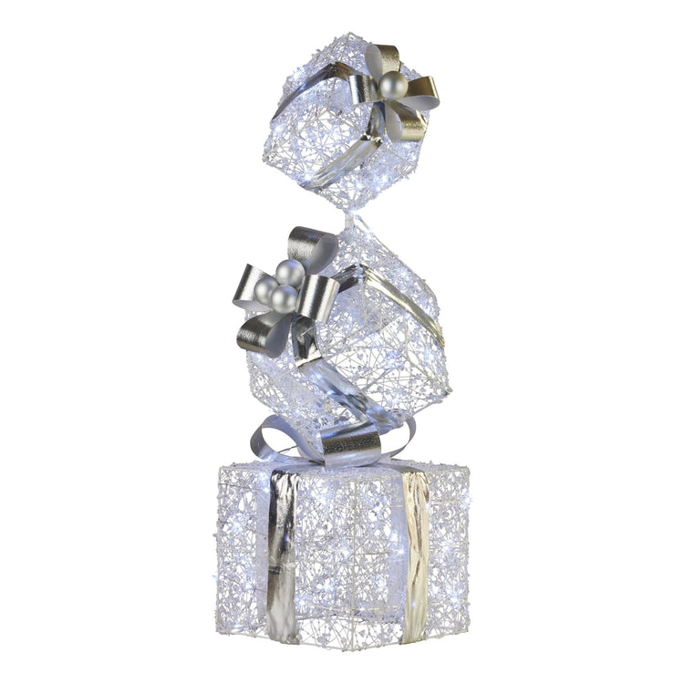 Bring the brilliant shine of this gorgeous triple Christmas gift box stack display to your holiday setup! Its decked out in a silver colour scheme, cool white LED lights and eye-catching pearl string wire. Each box is topped off with stunning silver bows for that extra touch of elegance. This gift stack display will definitely add a magical and festive vibe to your celebrations!