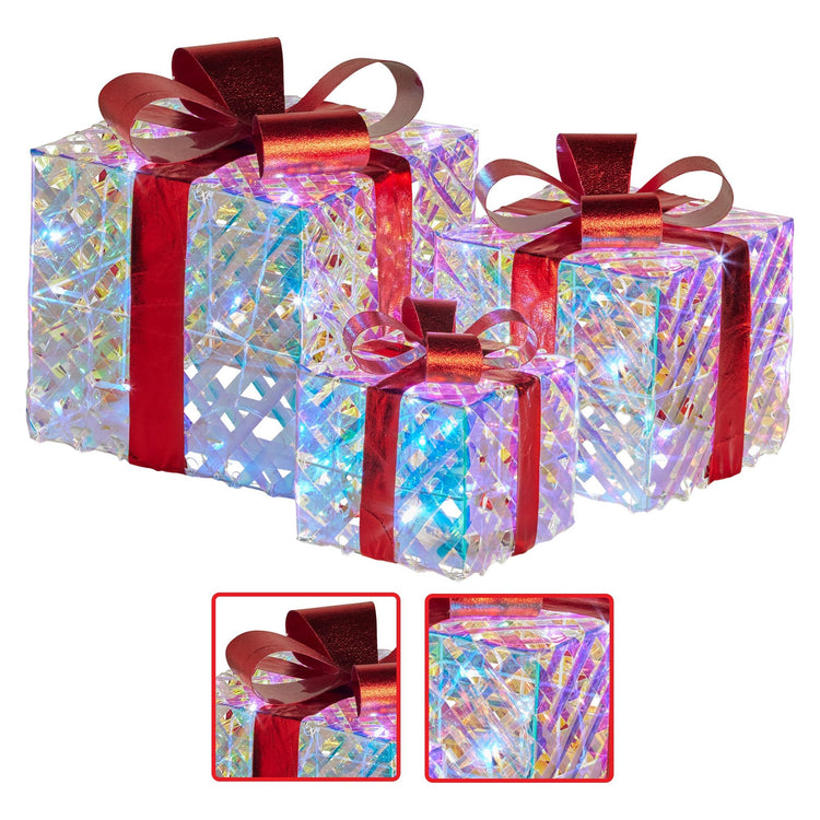 Get into the festive spirit with the charming ambience of this set of 3 Christmas giftbox displays! These three boxes are ideal for indoor decorating, featuring 60 cosy white LED lights, clear shimmery woven straps and bold red bows. With separate battery compartments for each box, you can easily place them anywhere you like. Let these beautifully lit gift boxes add a touch of magic to your holiday decor!