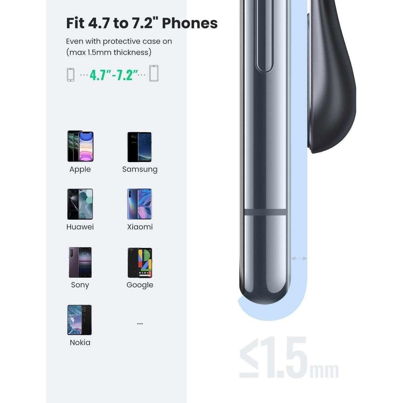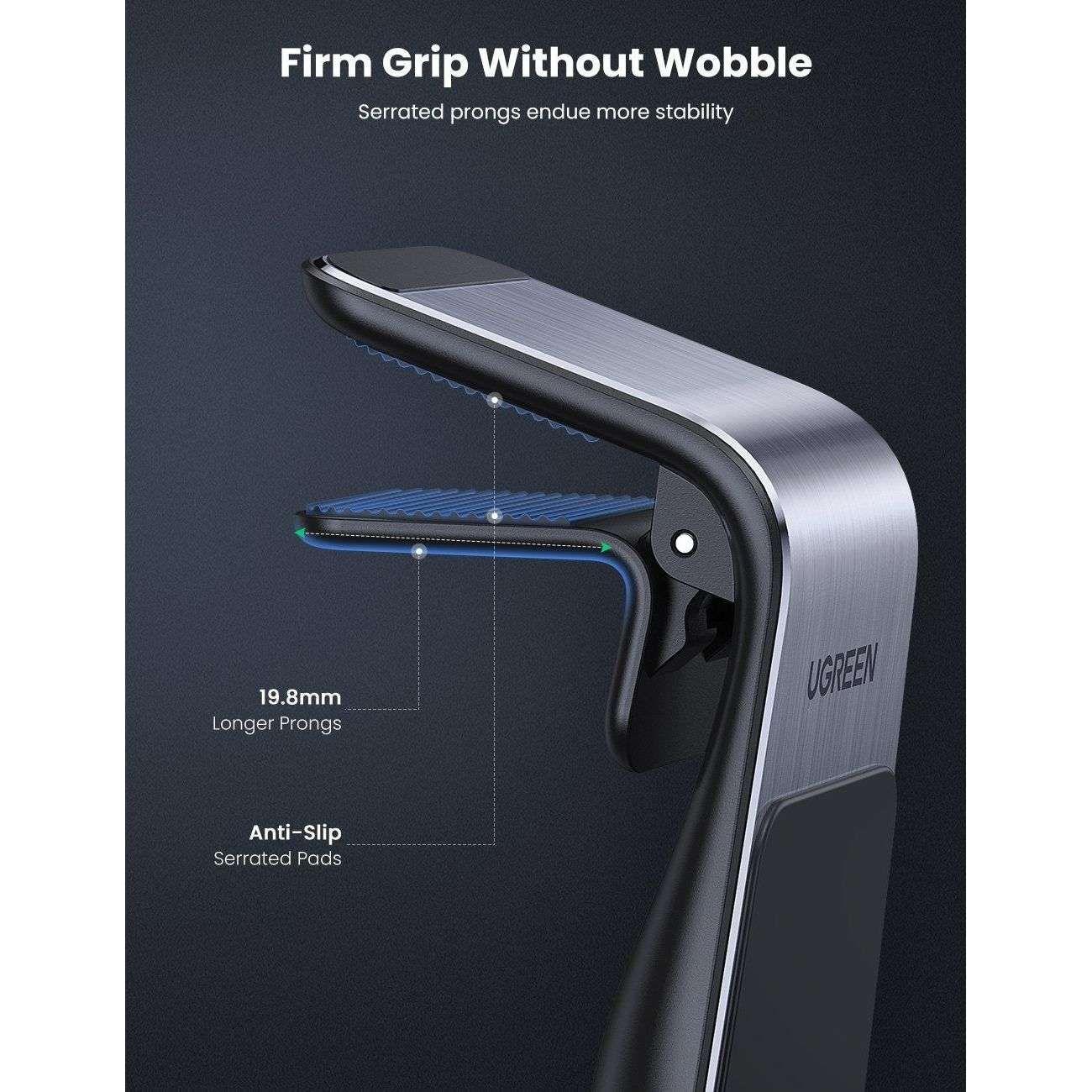 UGREEN Magnetic Air Vent Car Mount features powerful neodymium magnets(5 ×N52 magnets), longer serrated prongs(19.8mm), aluminum unibody, and anti-slip rubber cushions. The Magnetic Car Clip Phone Holder attaches to the air vents tightly and holds the phone in place even on bumpy roads or sudden braking, offering incredible stability and safety. Two different magnet metal plates can be chosen based on the road conditions and your phone\'s size.