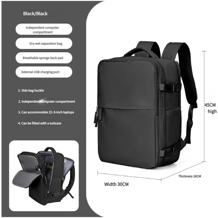 Water-Resistant Laptop Backpack with USB Charging Port – Stay organized and connected on the go with this sleek black laptop backpack. Designed for modern professionals, it features a dedicated laptop compartment that fits up to 15.6-inch laptops, wet-dry separation pockets for clothes or toiletries, and an external USB charging port to power your devices anywhere. The ergonomic design includes breathable memory foam padding for comfortable wear, making it perfect for work, travel, or daily use.