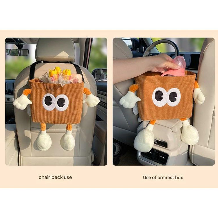 The bin features a charming cartoon design with large white eyes, plush arms, and legs, adding a fun element to your car's interior. Its adjustable strap allows for easy mounting on the back of a headrest, making it accessible for both front and rear passengers. The water-repellent material protects against light spills, ensuring your belongings stay dry. Whether you're on a road trip or a daily commute, this car trash bin is a practical and adorable addition to your vehicle.
