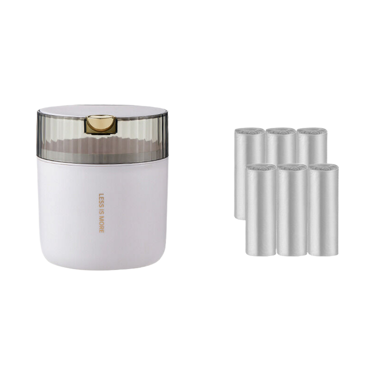 White desktop garbage bin (standard 6-roll garbage bag) 14cm * 15cm (including button) * 16cm, material: transparent: PET gold-plated: ABS solid color: PP, packaging method: independent cardboard box+bundling
